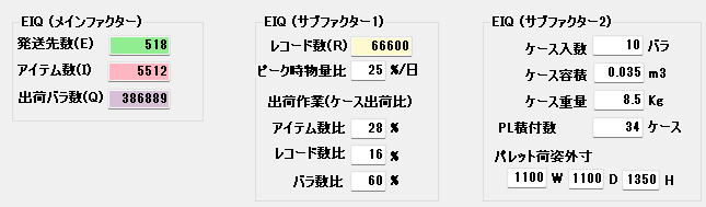 物流設計の大家・鈴木震先生は「発送先数(E)・アイテム数(I)・数量(Q)はメインファクターである」と述べています。これに「計算ルール」というサブファクター(変数)を組み合わせることで、精度は飛躍的に向上します。