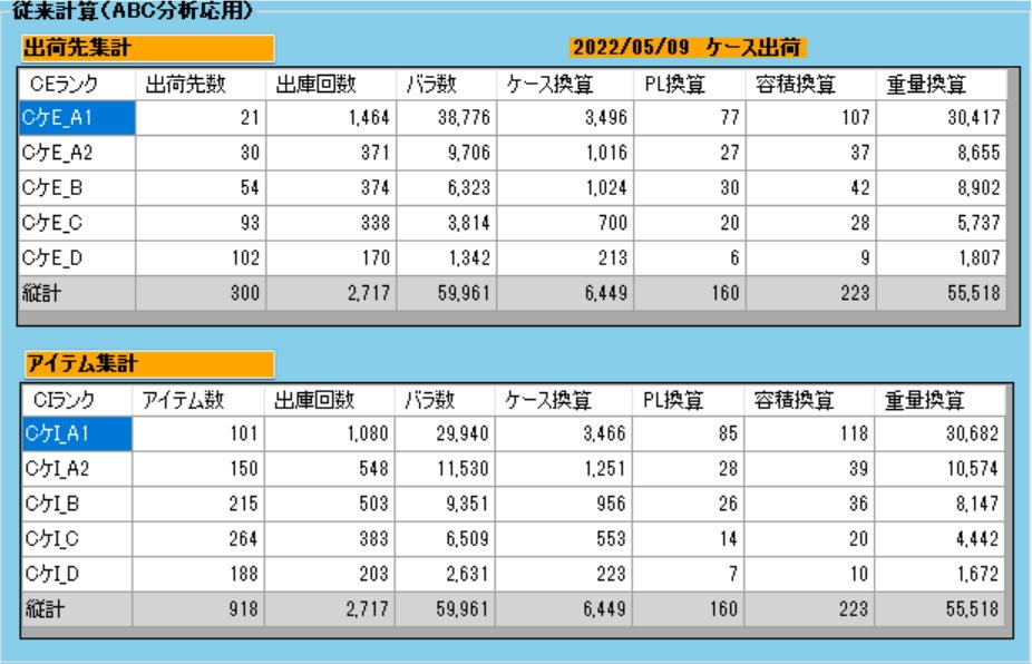 下記表はABC分析手法で5グループに分けた集計表です![]() 出荷先(E)とアイテム(I)が別々に集計されています。多くの項目が一覧 できます。合計値は一緒ですが、出荷先(E)のランク内容とアイテム(I)のランク内容の関連性は全くありません。 |