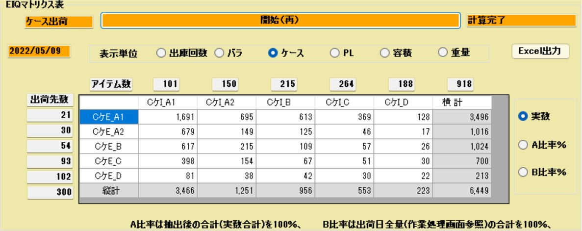 下記はEIQ分析のEIQマトリクス表です。![]() 出荷先(E)とアイテム(I)がクロス集計されています。ケース換算(1項目)につての集計です。 縦計が出荷先(E)集計で横計がアイテム(I)集計です。合計値は一緒です。、出荷先(E)のラック内容とアイテム(I)のラック内容は完全一致してます。 CケI_A1ランクの商品1691ケースがCE_A1ランクから出荷していることが解ります。 結論として、ABC分析は大局的に見るとき、EIQ分析は詳細に分析するとき、いう関係かな。 |